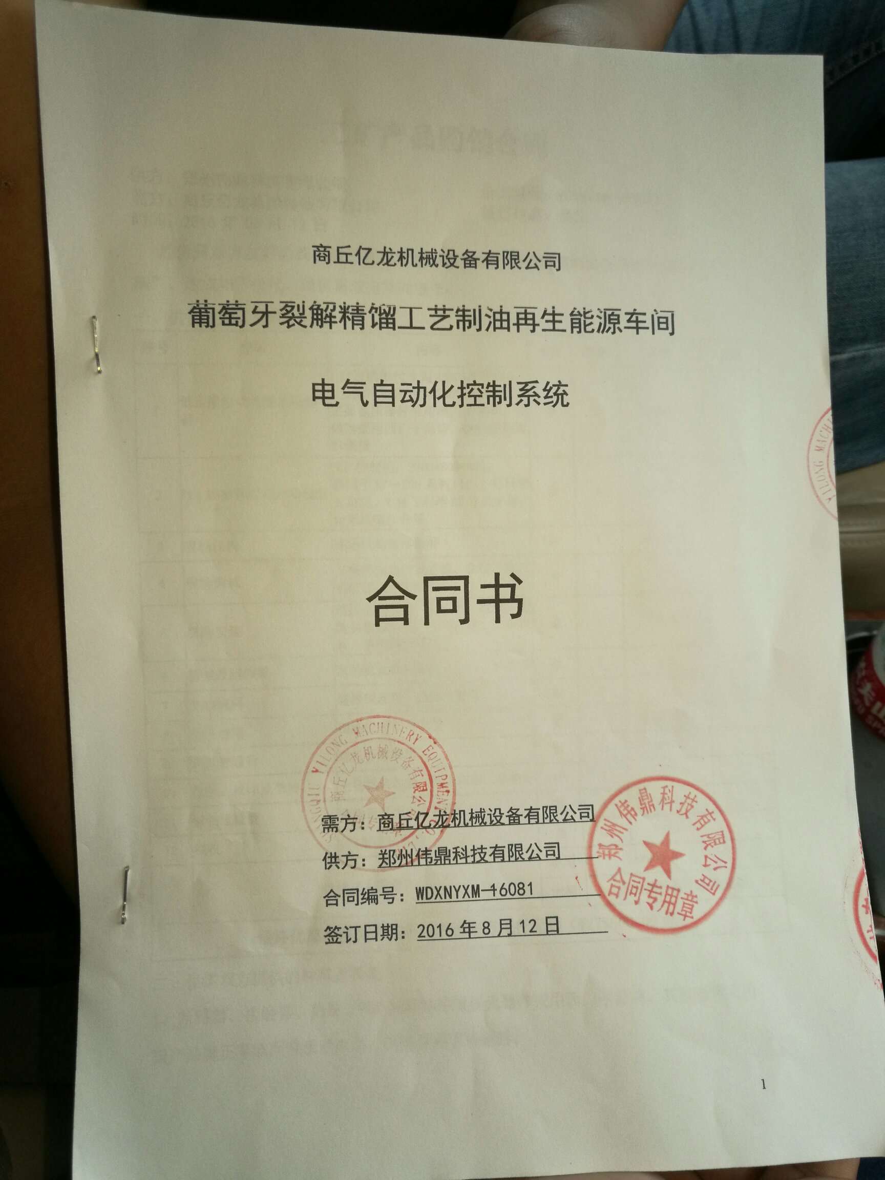 2016年8月12日,我公司與商丘億龍機械設備有限公司就葡萄牙一套“廢舊輪胎塑料裂解精餾制油生產線電氣自動化控制系統”順利達成合作協議。